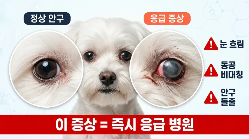 📌 핵심: 눈 흐림·동공 비대칭·안구 돌출 중 하나라도 있으면 즉시 병원 응급 방문이에요.
