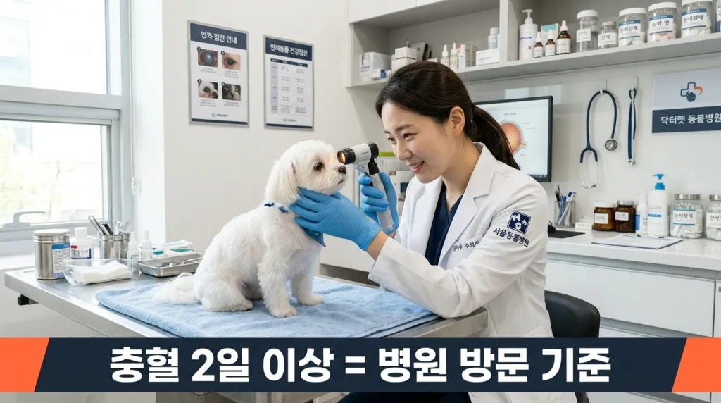 ✅ 충혈이 2일 이상 지속되거나 눈을 못 뜰 정도라면 즉시 동물병원을 방문해야 해요.